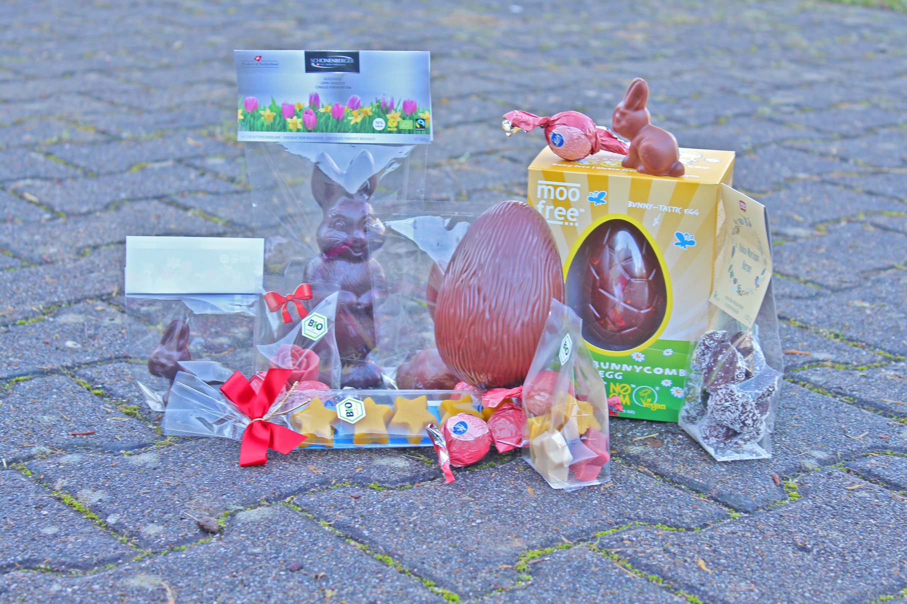 Große und kleine Hasen aus zarter Bio-Reisschokolade, die Kinderherzen bei der Osternestsuche höher schlagen lassen.