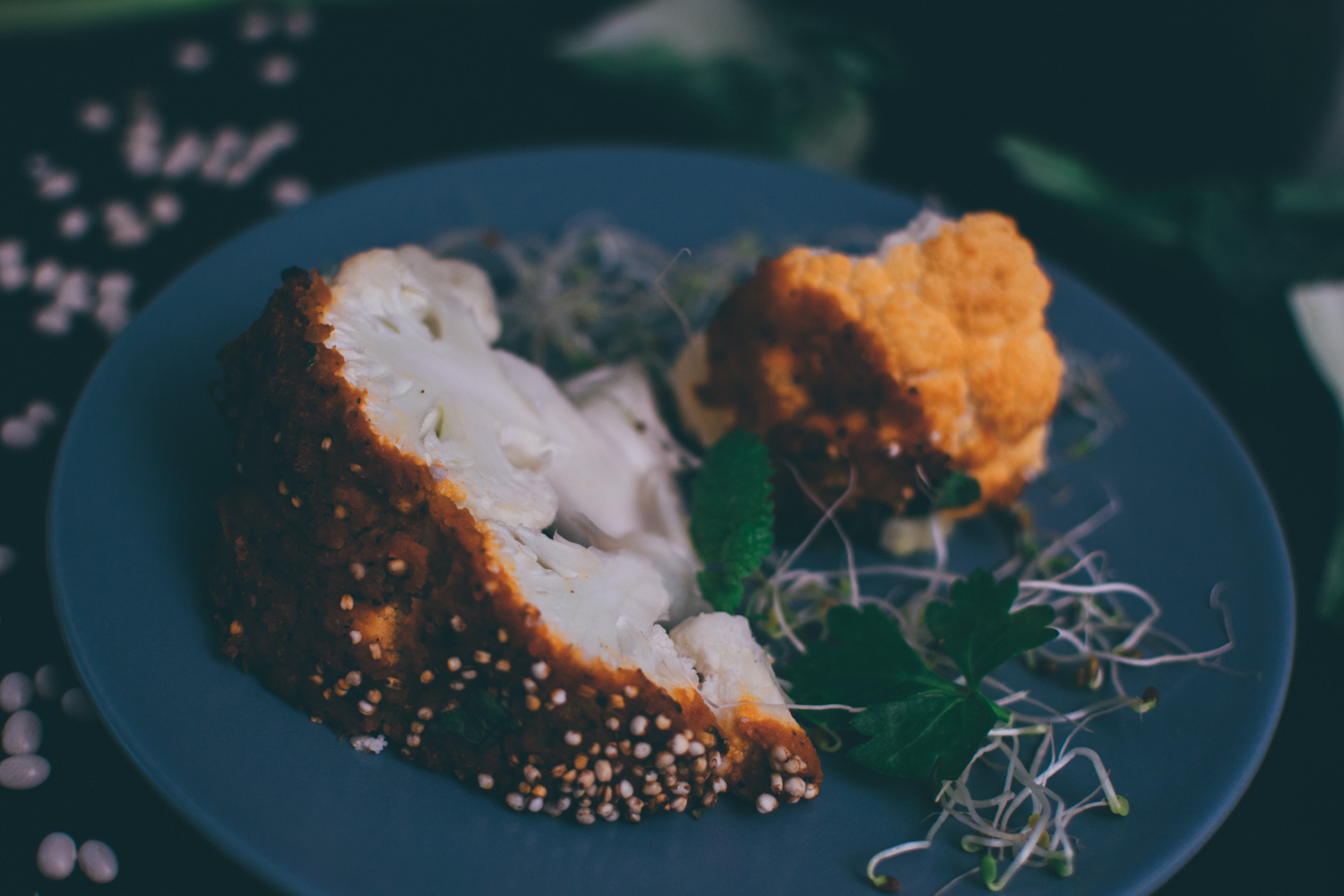 4. Zum Schluss haben wir noch ein bisschen gepopptes Quinoa auf dem Blumenkohl verteilt und das ganze mit frischen Kräutern verfeinert.