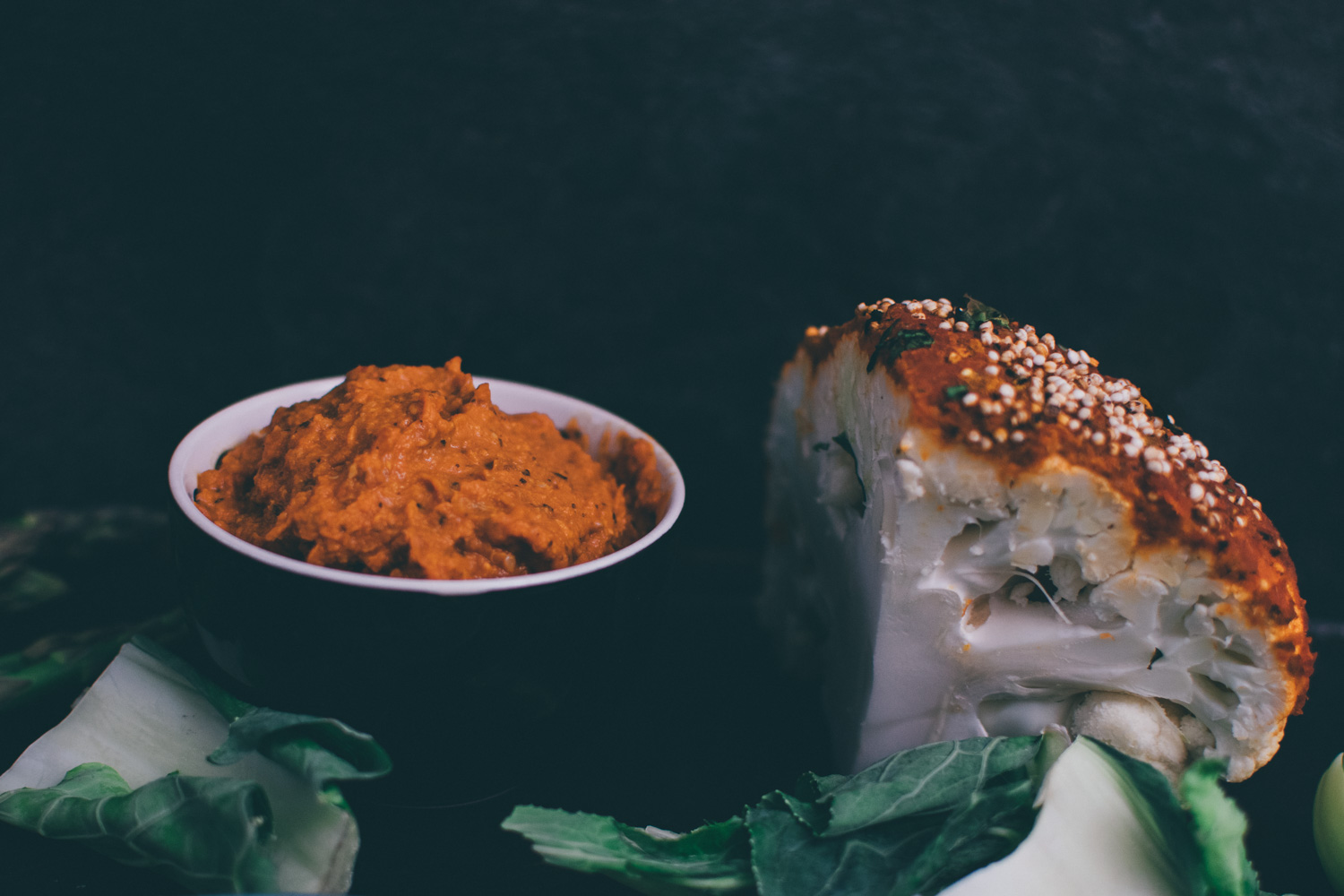 2. Jetzt braucht ihr euren „Liebling“ in Sachen herzhafte Brotaufstriche. Hier ist die Wahl vollkommen euch überlassen. Verteilt den Aufstrich gründlich auf dem Blumenkohl.