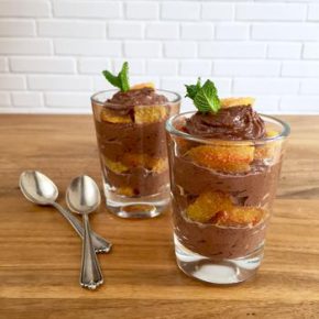 3. Die Schokomousse in einen Spritzbeutel geben und mit einem großen Aufsatz in 2-3 kleine Gläschen schichten. Dabei jeweils eine Schicht Schokomousse und eine Schicht Orangenfilets anrichten. Mit einem Minzblatt garnieren.