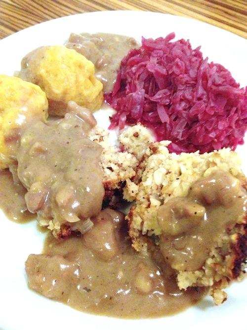 Susannes Zitronenrotkraut und Süßkartoffel-Kürbis-Knödeln zu Nussbraten mit Maronensauce