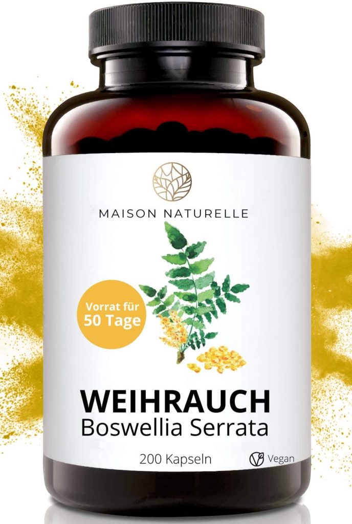 Die Weihrauchkapseln von MAISON NATURELLE ist hochdosiert und reicht für 50 Tage. Es enthält 1600 mg Weihrauch pro Tagesdosis und davon davon 1040mg Bosweliasäure. Die Kapseln sind zu 100% vegan und ohne unnötige Zusätze, glutenfrei, GMO-frei und frei von Konservierungs- und Farbstoffen. Sie werden regelmäßig von Laboren auf Qualität und Verunreinigungen wie Schwermetalle, mikrobielle Belastungen und Dioxine geprüft. 200 Kapseln kosten 12,90€.
