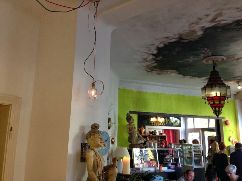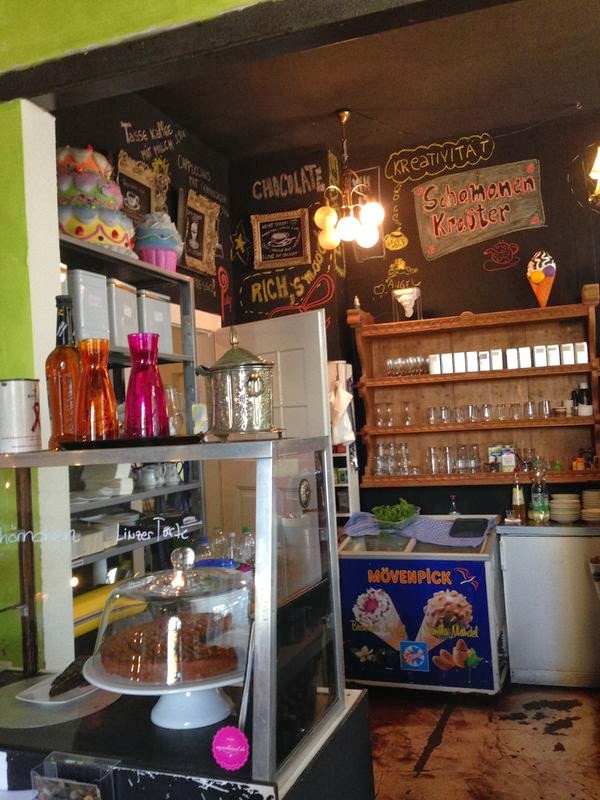 Das Café Zimt & Zucker ist absolut zuckersüß eingerichtet und man fühlt sich beim Betreten sofort pudelwohl. Es ist kein veganes Café, aber als Claudi und ich uns letztens dort getroffen haben, gab es 3 verschiedene vegane Kuchen zur Auswahl: Zwetschgenkuchen, Kirschkuchen oder Waldbeer für jeweils 2,90 €. Darüber hinaus hat es eine große Teeauswahl und die diversen Kaffeespezialitäten kann man auch mit Sojamilch bekommen.